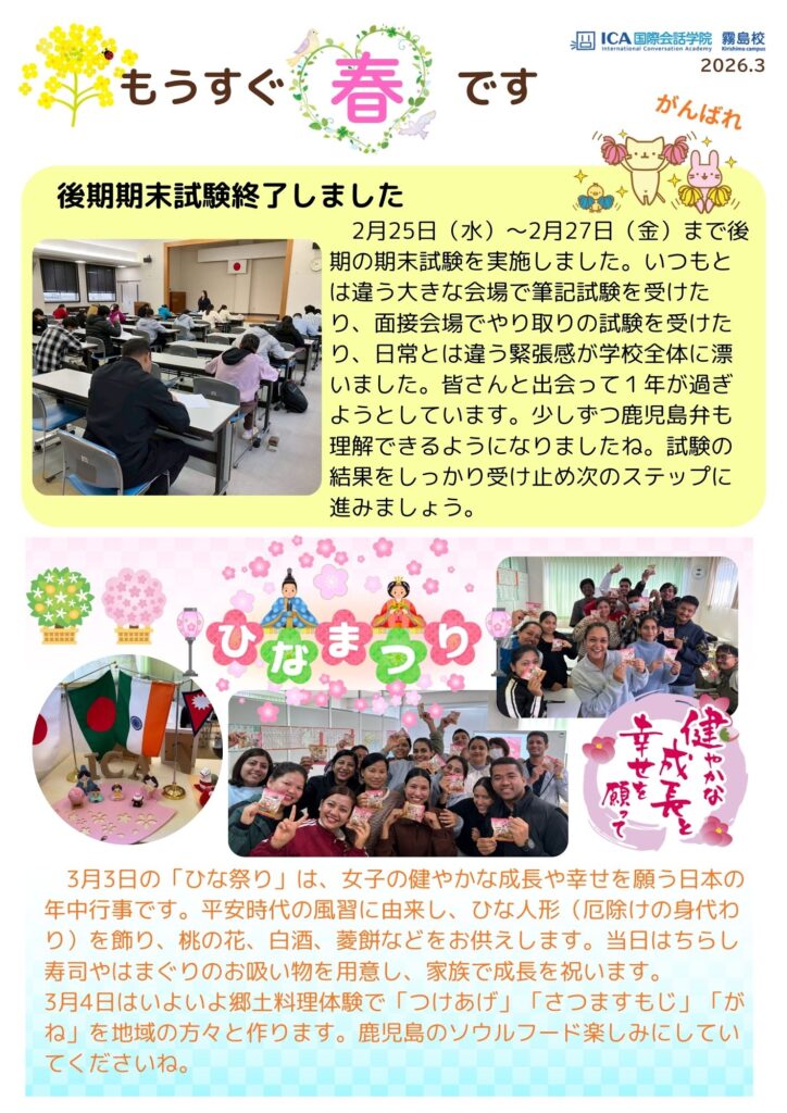 「期末試験」と「ひな祭り」の記事を公開しました。